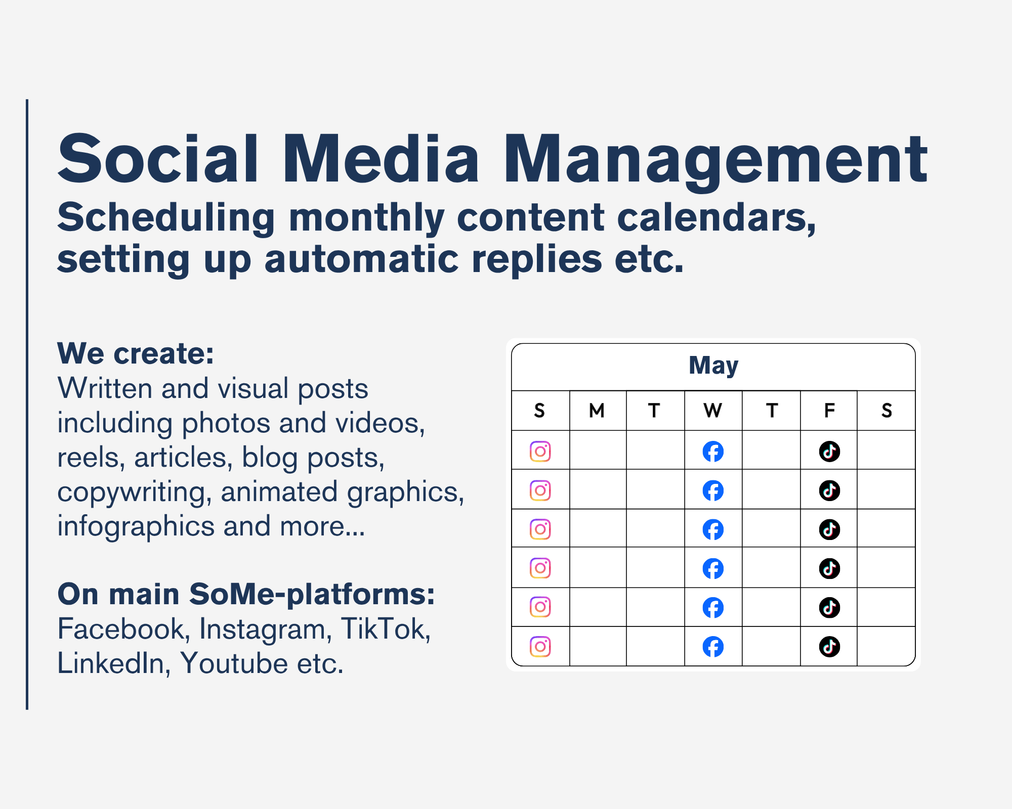 - Social Media Management: Monthly content calendars, branded posts, animated infographics